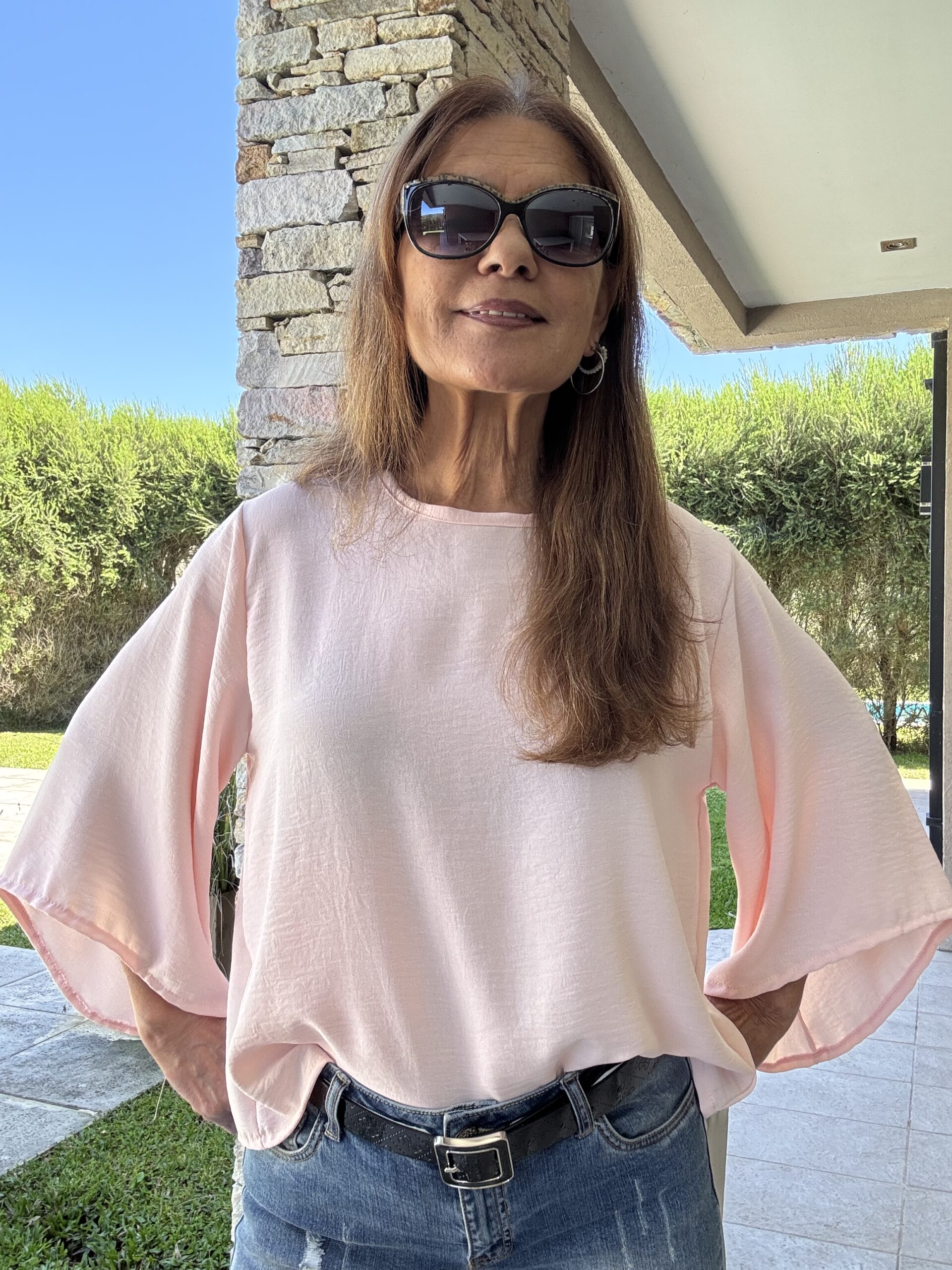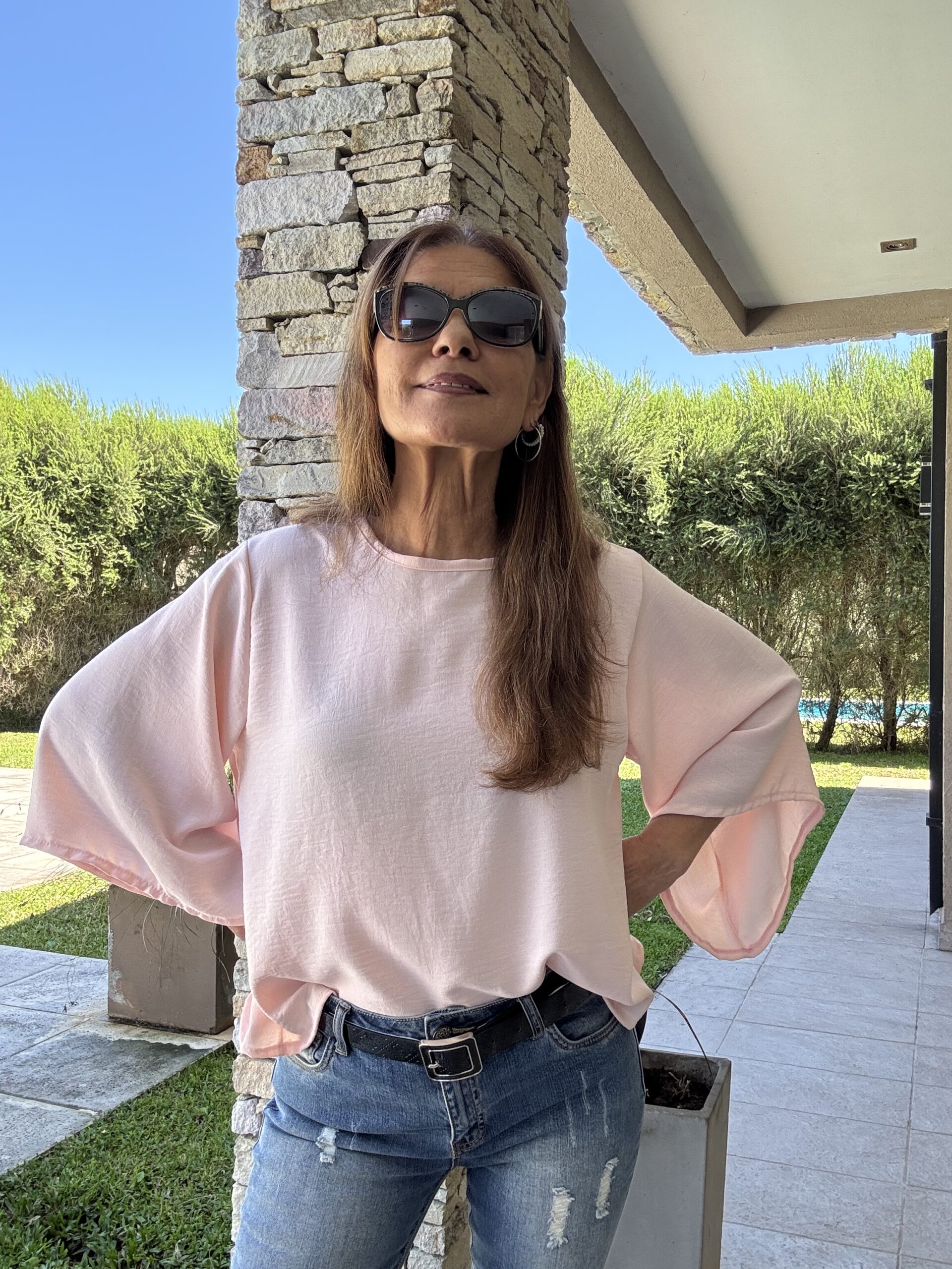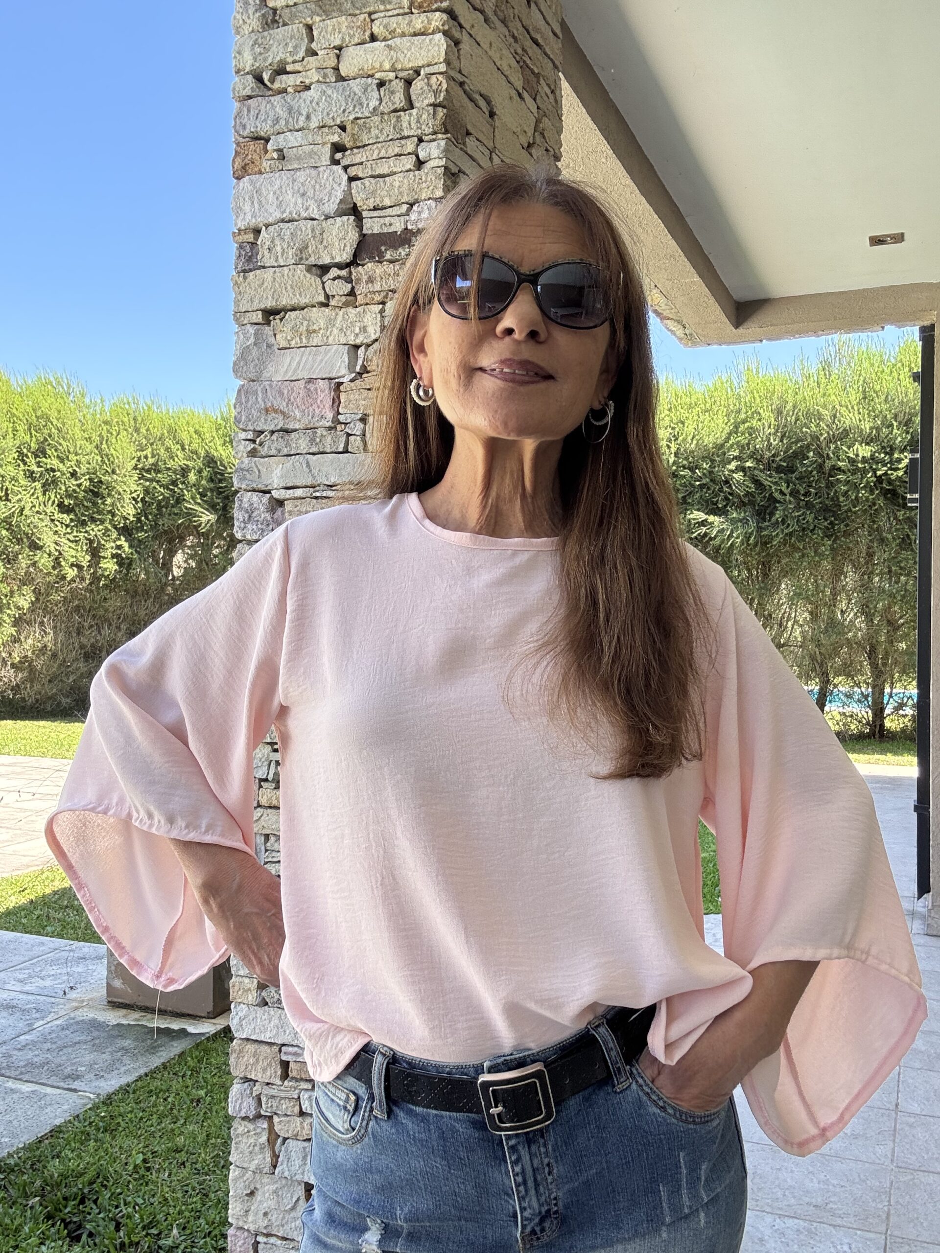 Blusa en crepé liviano, color rosa pastel. Diseño suelto con mangas murciélago y detalle trasero con lazo ajustable. Una prenda fresca y femenina, ideal para looks versátiles y cómodos.