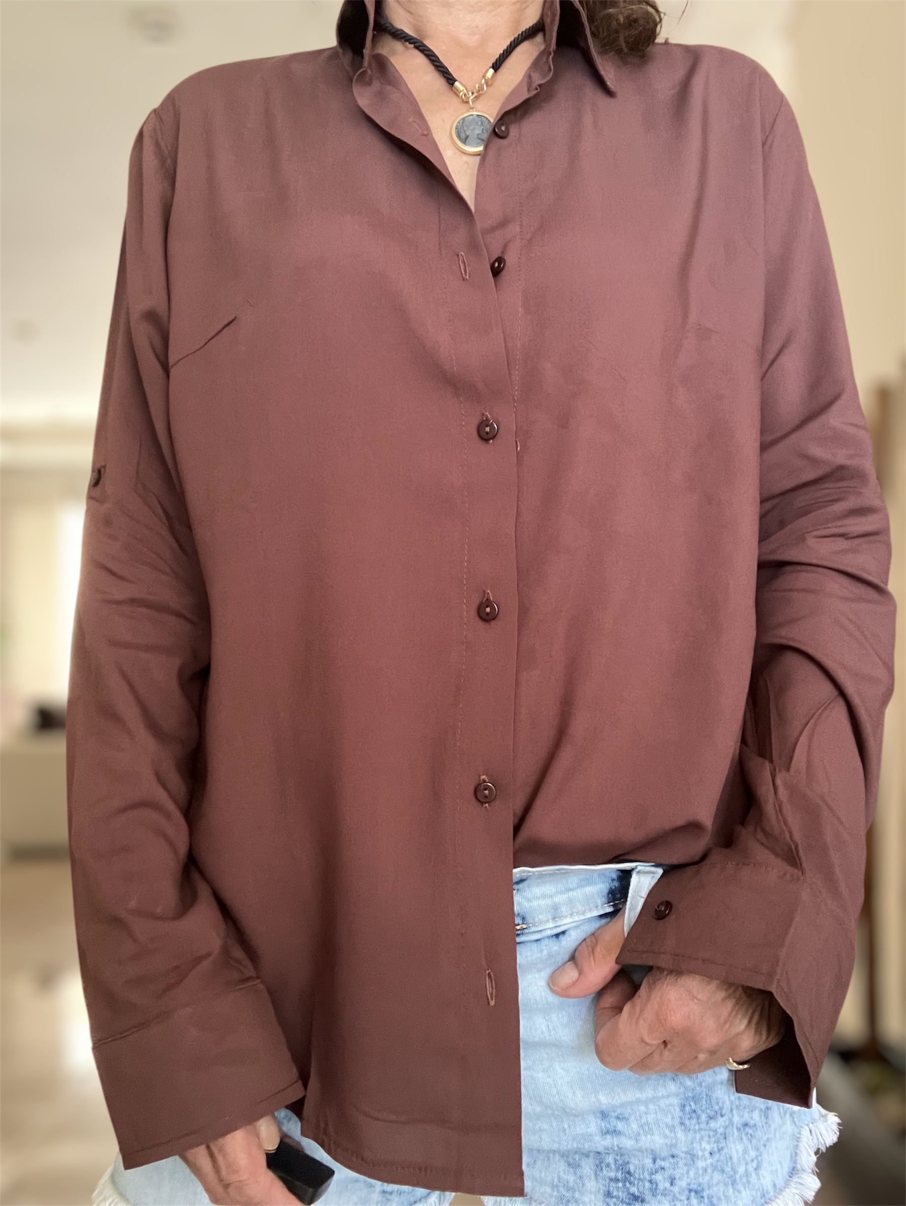 Camisa mocha mousse algodón pieza clave para un armario inteligente. Inspirada en la calidez del café y el cacao, esta prenda no solo es versátil, sino que también realza tu belleza natural con su colorimetría perfecta. Este tono combina a la perfección con otros neutros (blanco roto, crema, gris carbón) y hace que los colores vibrantes (como el azul marino, el verde oliva, o el rojo quemado) resalten con una base elegante.