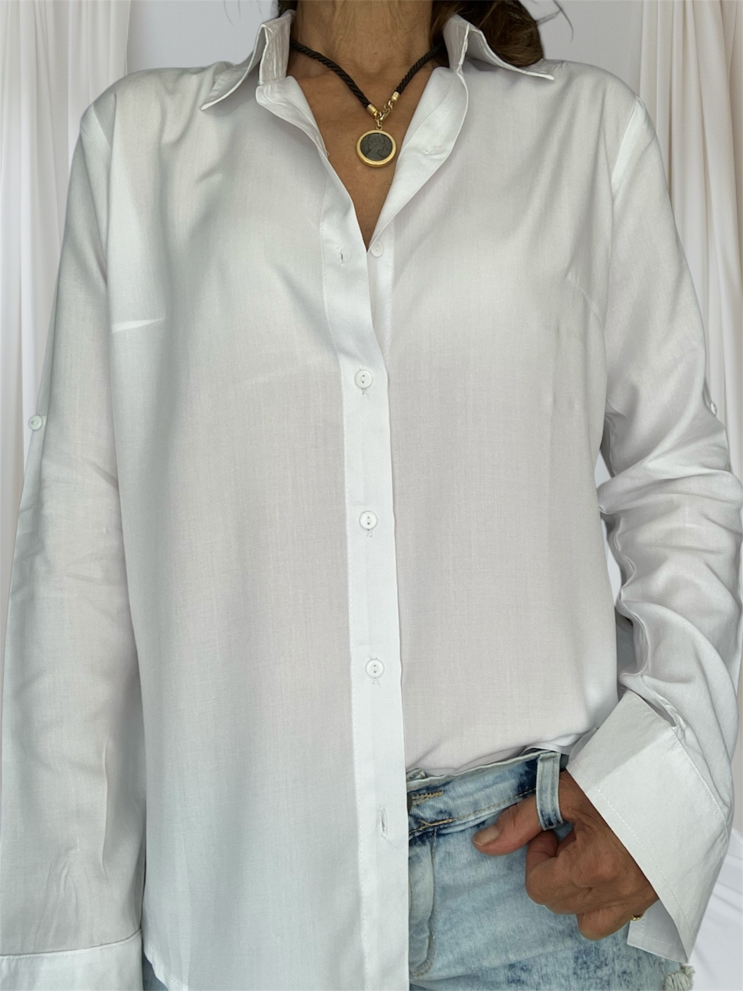 El blanco puro es el color universal por excelencia, ya que refleja la luz de manera nítida, aportando brillo instantáneo al rostro.Llevalo con un pantalón negro para un look de alto impacto (Invierno), o con jeans celeste para una vibración fresca y suave (Verano/Primavera).