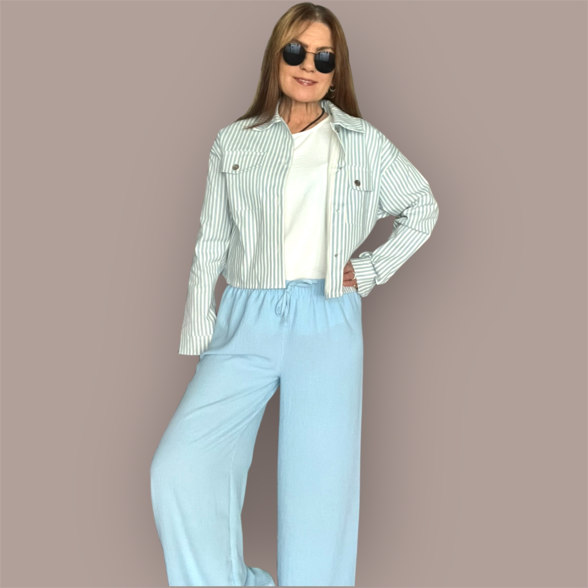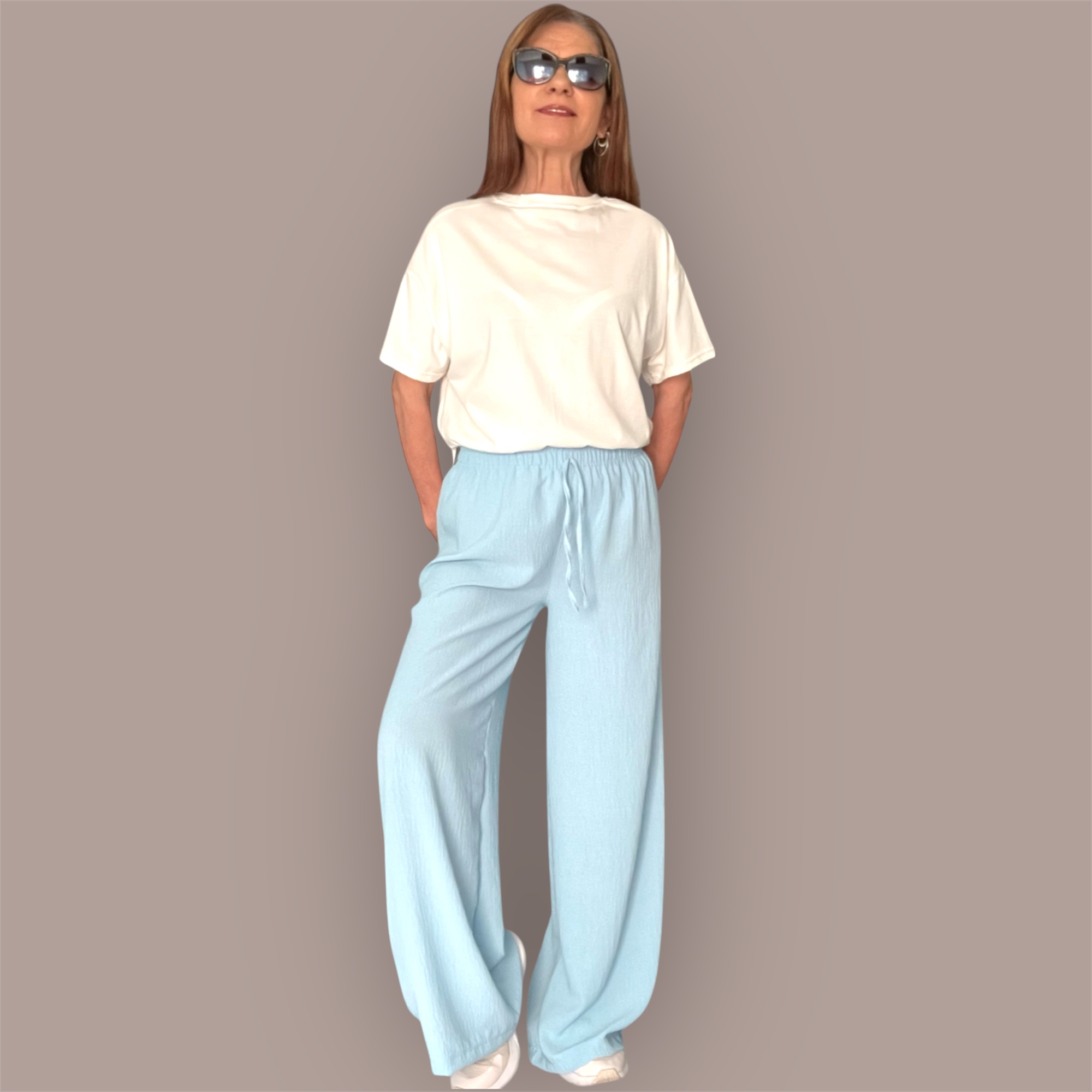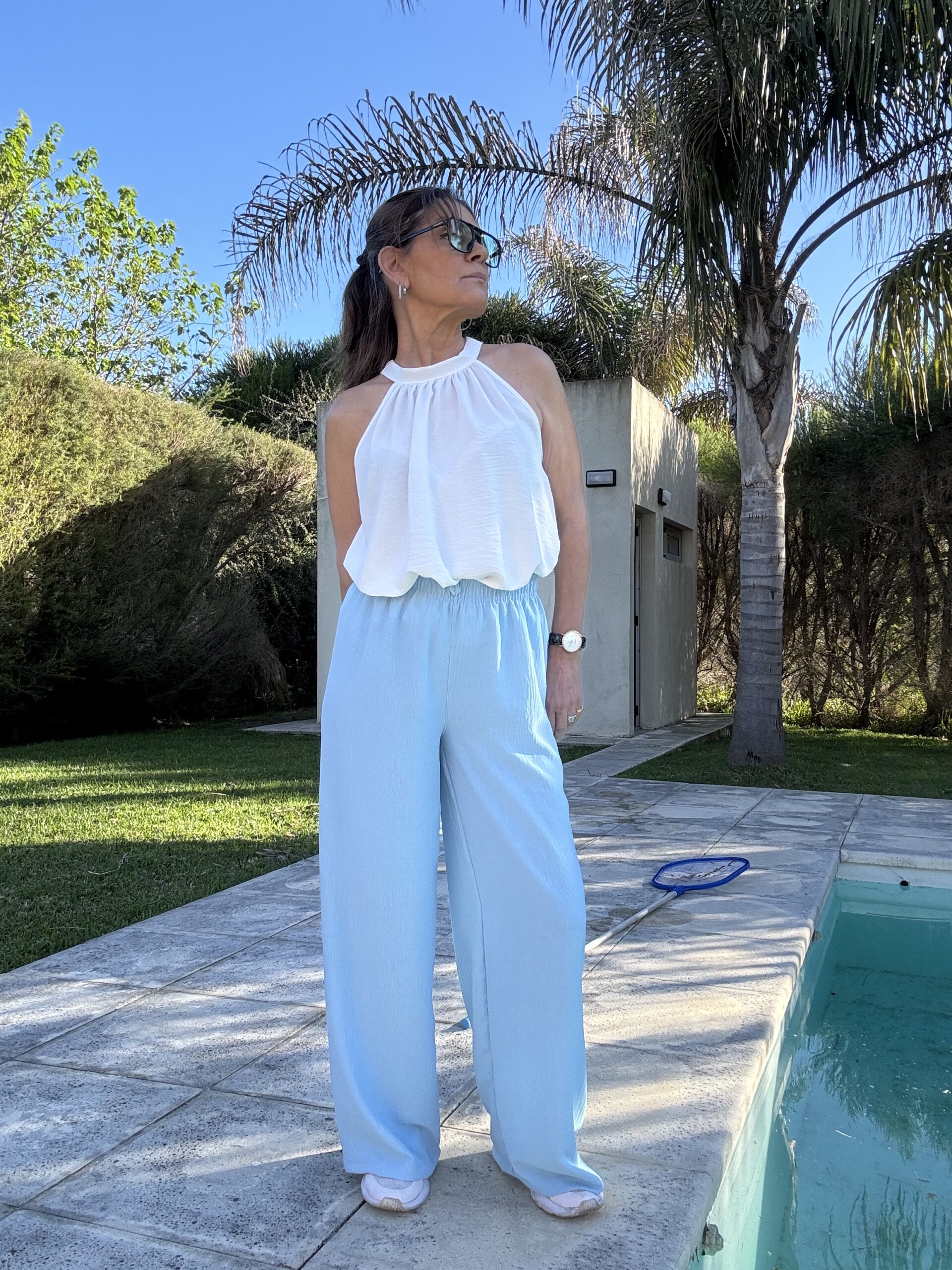 Pantalón Palazzo con cintura elástica y lazo, confeccionado en crépe liviano con caída elegante y un calce favorecedor. Gracias a su diseño versátil, puede usarse con blusas, camisas o remeras para looks tanto casuales como sofisticados. Su material fluido y cómodo lo convierte en una opción ideal para todo el día.