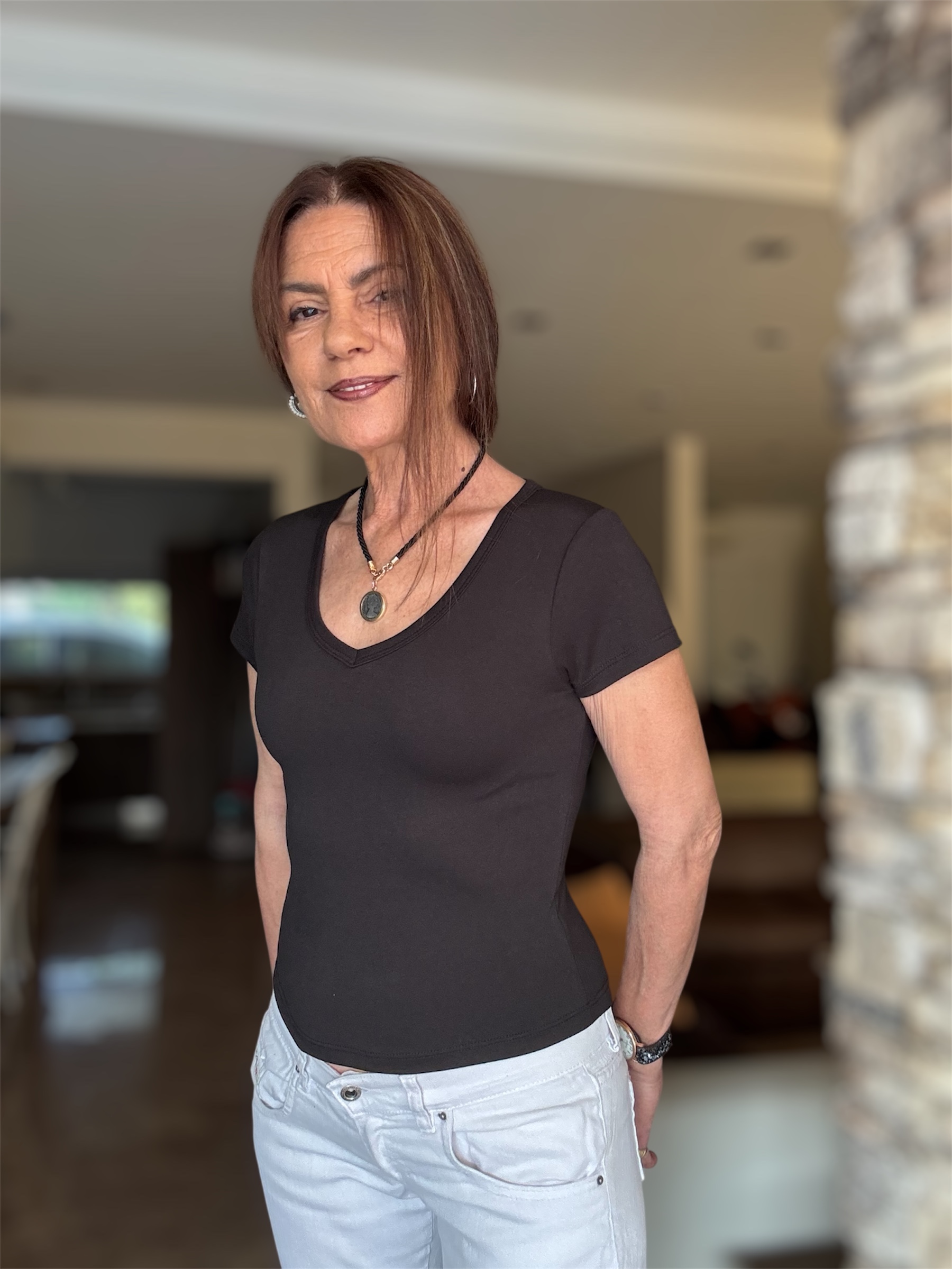 Remera crop escote V algodón. Luce espectacular en personas con colorimetria fría. El escote V alarga visualmente el cuello y estiliza la parte alta del torso. Medidas ancho 40 largo 48