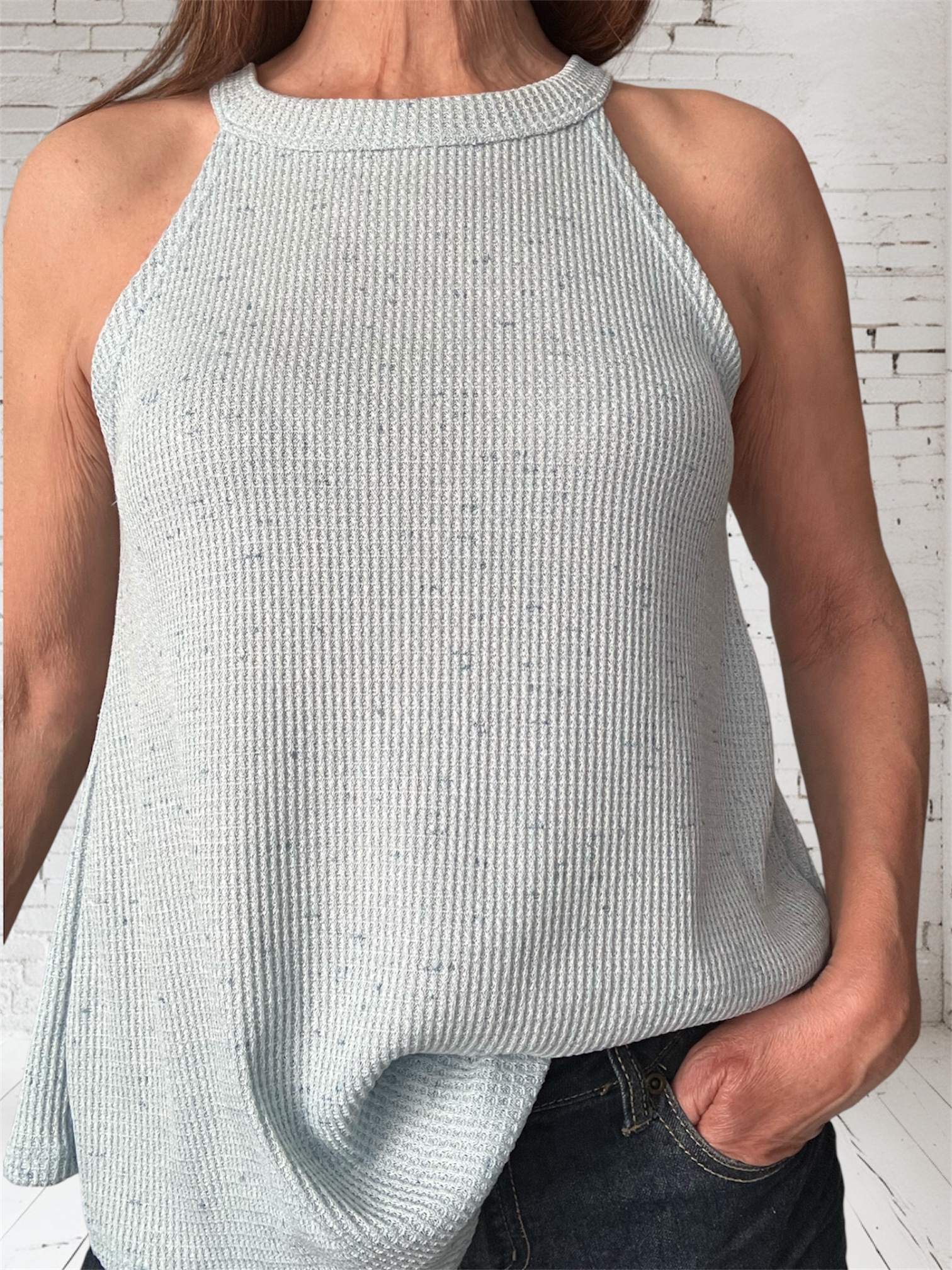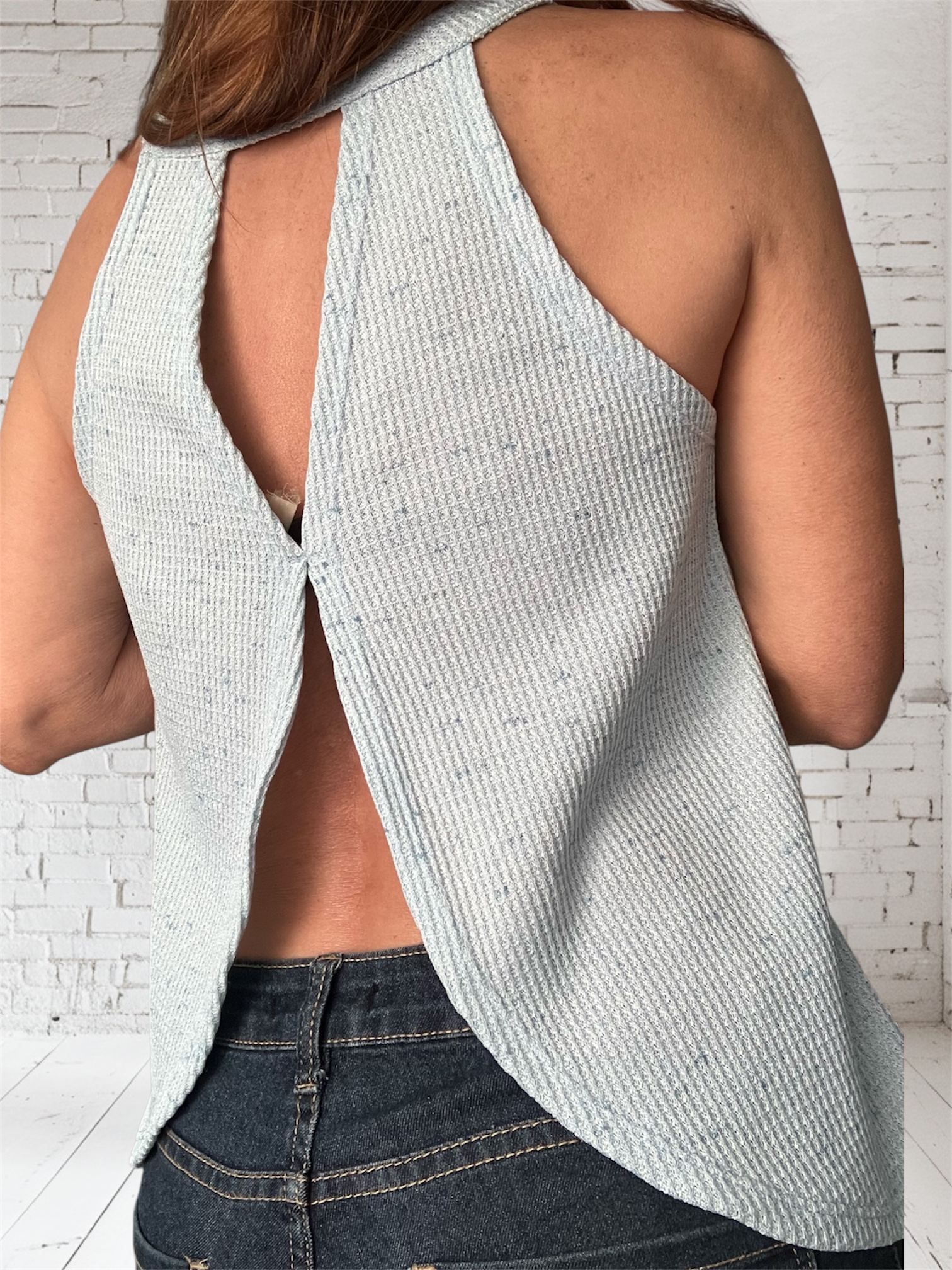 Top celeste claro. Favorece a subtonos de piel frios y neutros. Su diseño halter resalta hombros y su corte fluído permite disimular abdomen, el corte en la espalda da un toque de sensualidad