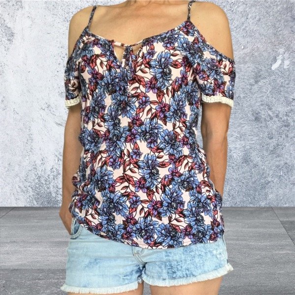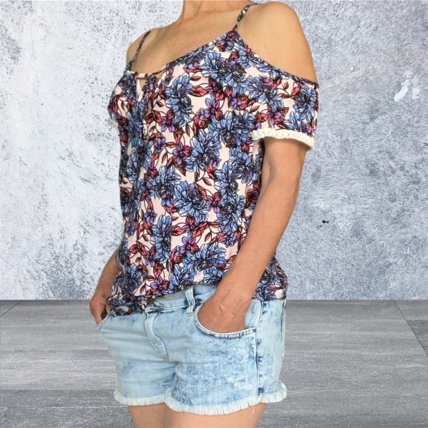 Top de corte moderno y favorecedor que expone sutilmente los hombros, creando un look sensual y delicado. Combina con shorts vintage para un look casual de verano, o usalo con pantalones blancos y sandalias para una salida más arreglada. Talle M